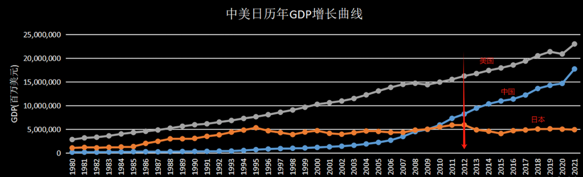 2012年是90年代以后日本和美国GDP差距最小的一年,当年日本的GDP为6.27万亿美元,2023年仅剩4.2万亿美元,当年美国的GDP为16.25万亿,日本GDP约为美国的38.6%。