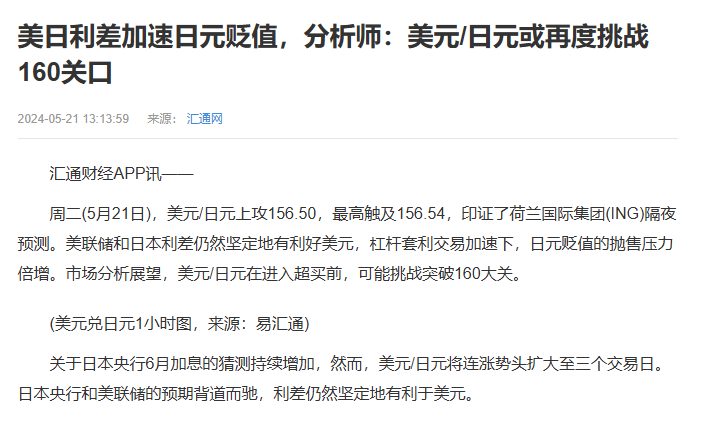 《美日利差加速日元贬值,分析师:美元/日元或再度挑战160关口》5月21日汇通网