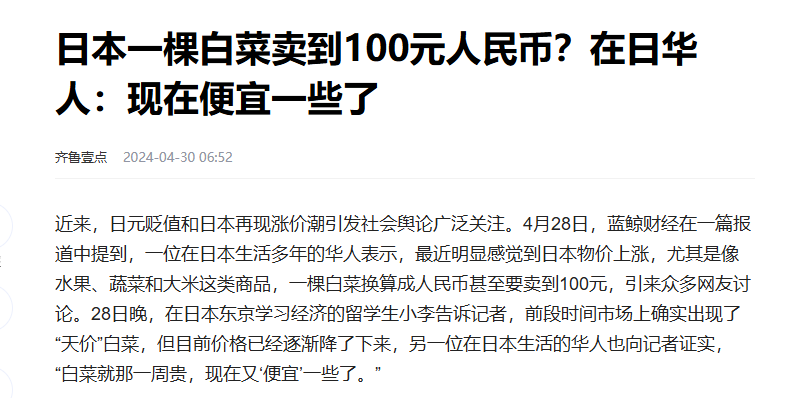 比如在目前的日本,一颗大白菜约100元人民币,这就是购买力。