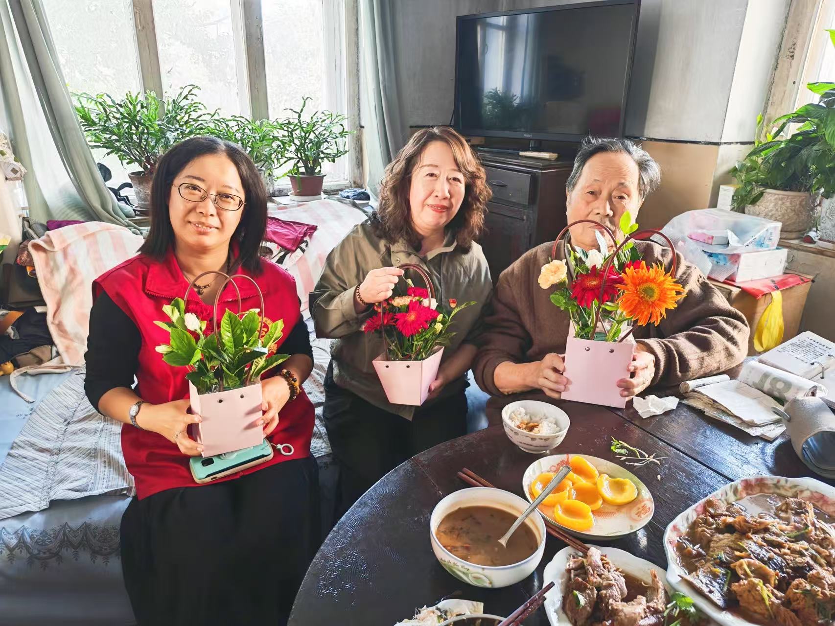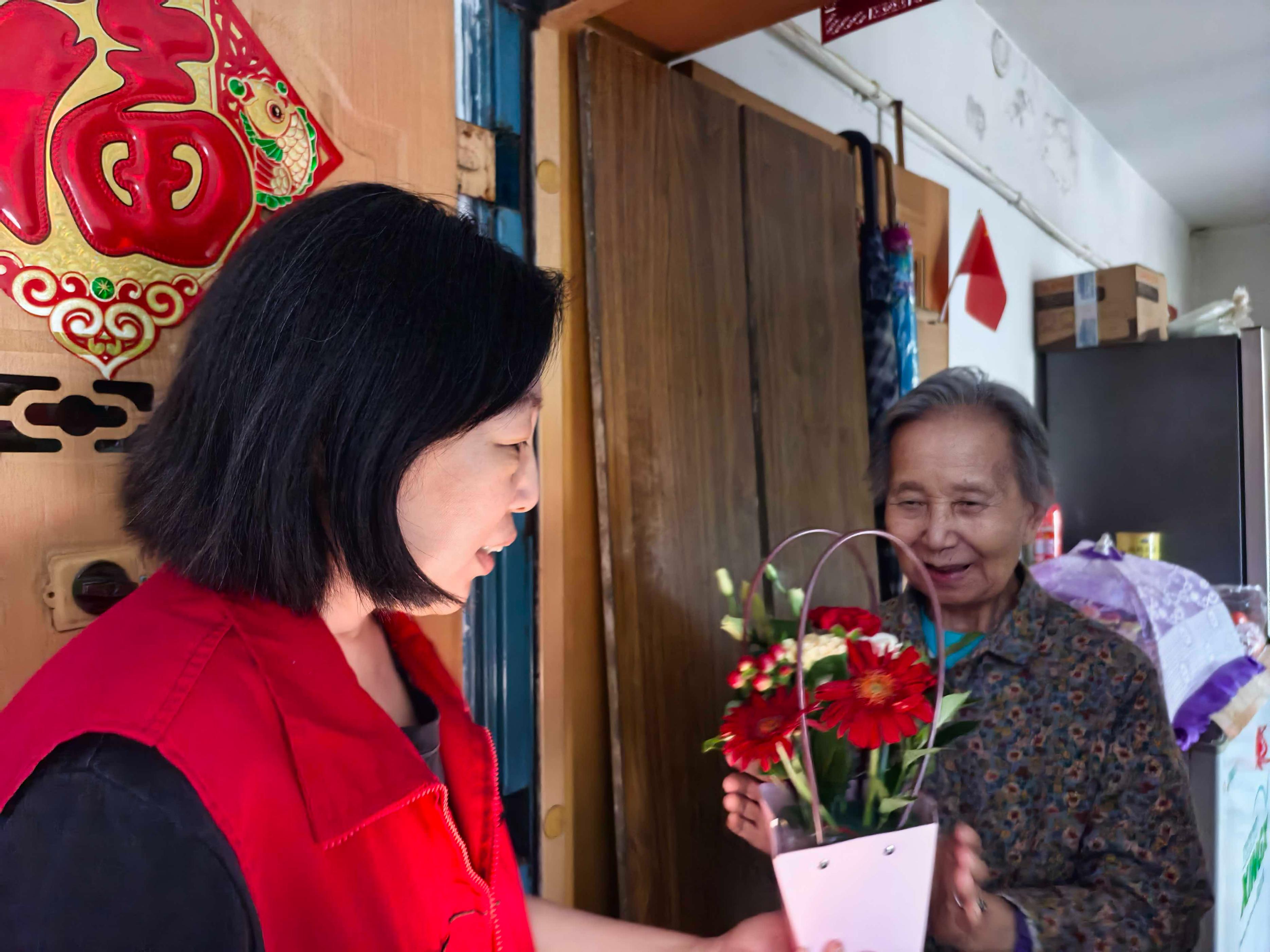 重阳节举办的插花活动,成了老人们嘴里念叨了好几天的“大事”。社区活动室里摆满了康乃馨、向日葵,老人们围坐在一起,跟着花艺老师学插花。活动结束后,志愿者们捧着亲手做的花艺,挨家挨户送到独居老人、高龄老人和退伍老兵家里。当敲开82岁退伍老兵孙爷爷的门时,老人正在看电视,接过花艺的瞬间,眼里亮了起来:“这花儿真好看,就像过年了一样。”