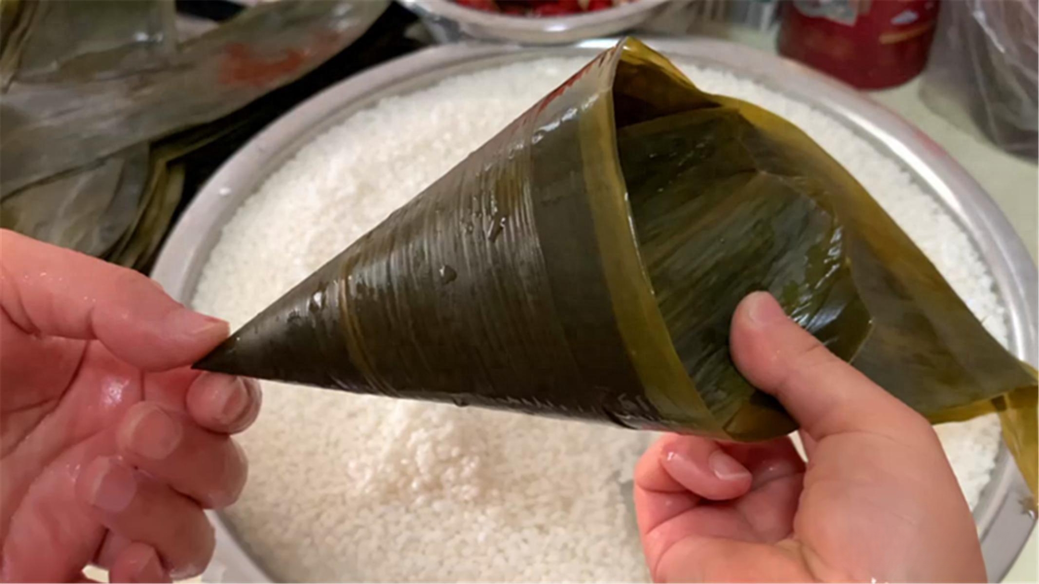 三、包粽子:将浸泡好的糯米沥干水分,加入适量的食用油和盐拌匀,这样煮出来的粽子更加香糯可口。取两片粽叶,光滑面朝内,粗糙面朝外,叠放在一起,然后从粽叶的三分之一处折成一个锥形。在锥形粽叶中填入一层糯米,然后放入你准备好的馅料,如豆沙、红枣等,再在馅料上盖上一层糯米。将粽叶折叠,盖住糯米,形成一个完整的粽子形状,然后用绳子紧紧绑住,以防粽子在煮的过程中散开。