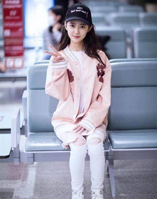 粉色的夹克内搭白色的T恤,裤子也是白色的破洞裤,一般的女生穿出来可能是非主流,但是,陈钰琪穿上却是一种粉嫩少女的味道,简直太会穿。
