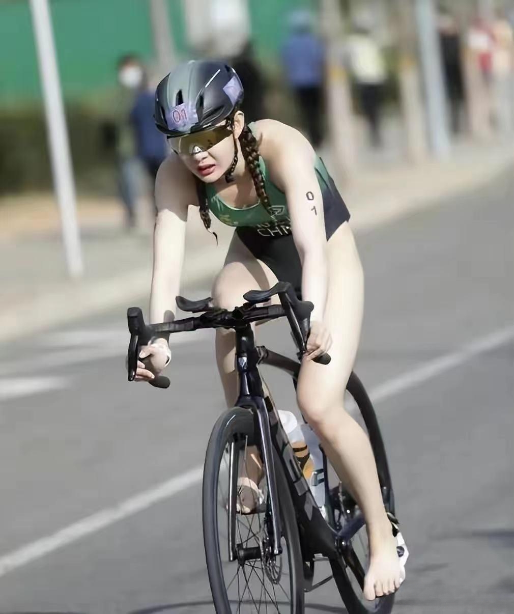 她在比赛中身穿着比赛服类似于泳装或者比基尼,在越野跑和自行车骑行中,凸显了她柔美青春的美丽。