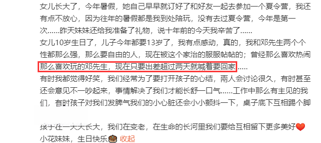长文中,她坦言“我和邓先生(邓超)都是个性好强、热爱自由的人”,但有了家庭子女后“现在被这个家治的服服帖帖的”,还隔空调侃老公“曾经那么喜欢热闹那么喜欢玩的邓先生,现在只要出差超过两天就喊着要回家”,称赞邓超婚后改变太多。