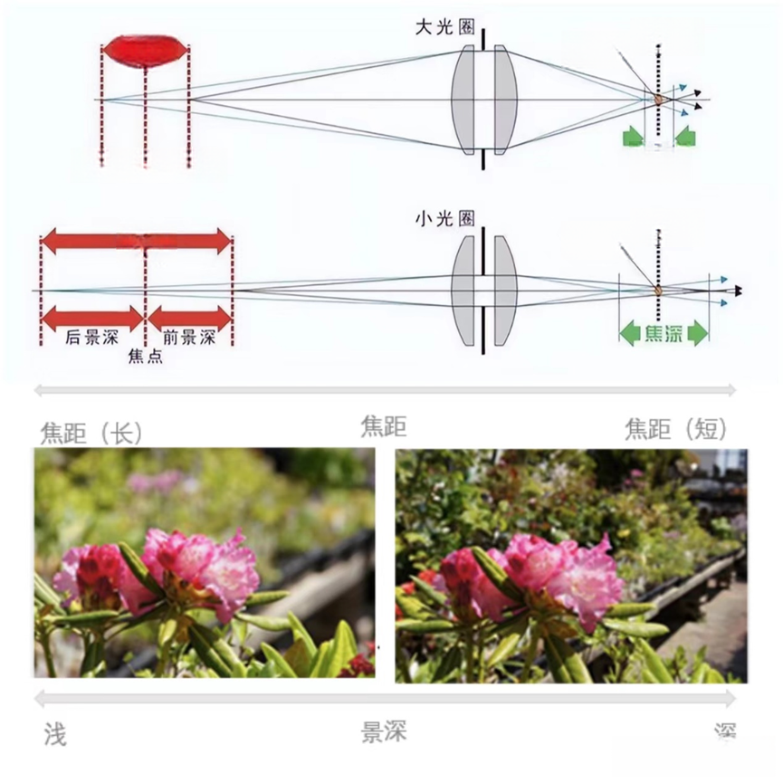 具体原理如下图所示,拍摄物体的景深与镜头后面的焦平面焦深成正关联。也正是因此,影响景深的指标不单止光圈,镜头的焦距越长或者拍摄的距离越近,那么景深就越浅。