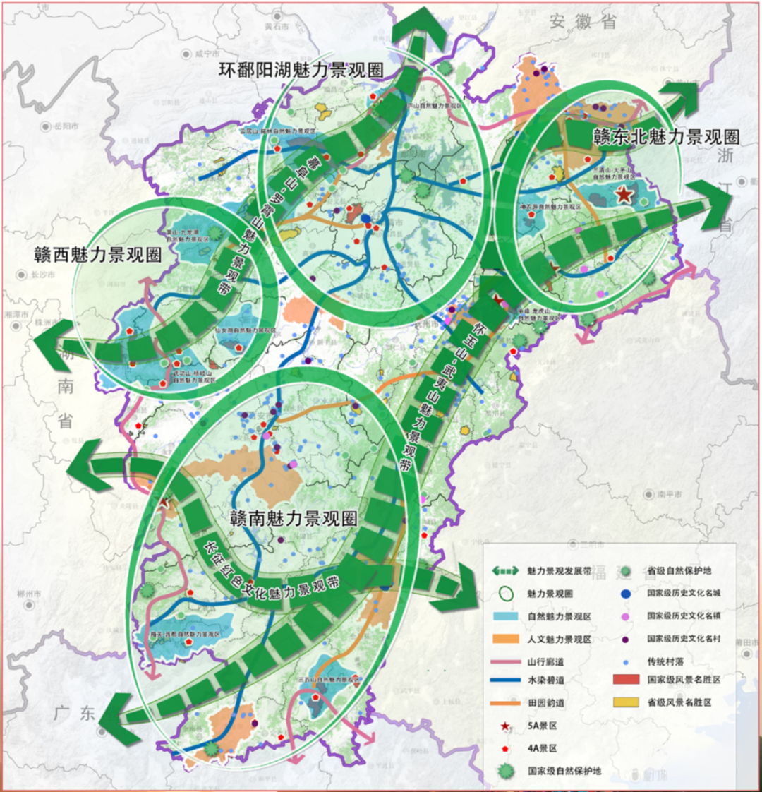 构建“四圈三带多区”魅力空间格局,“四圈”:环鄱阳湖魅力景观圈、赣西魅力景观圈、赣南魅力景观圈、赣东北魅力景观圈。“三带”:西部幕阜山 - 罗霄山魅力景观带、东部怀玉山 - 武夷山魅力景观带、南部长征红色文化魅力景观带。“多区”:自然魅力景观区、人文魅力景观区、乡村魅力景观区。