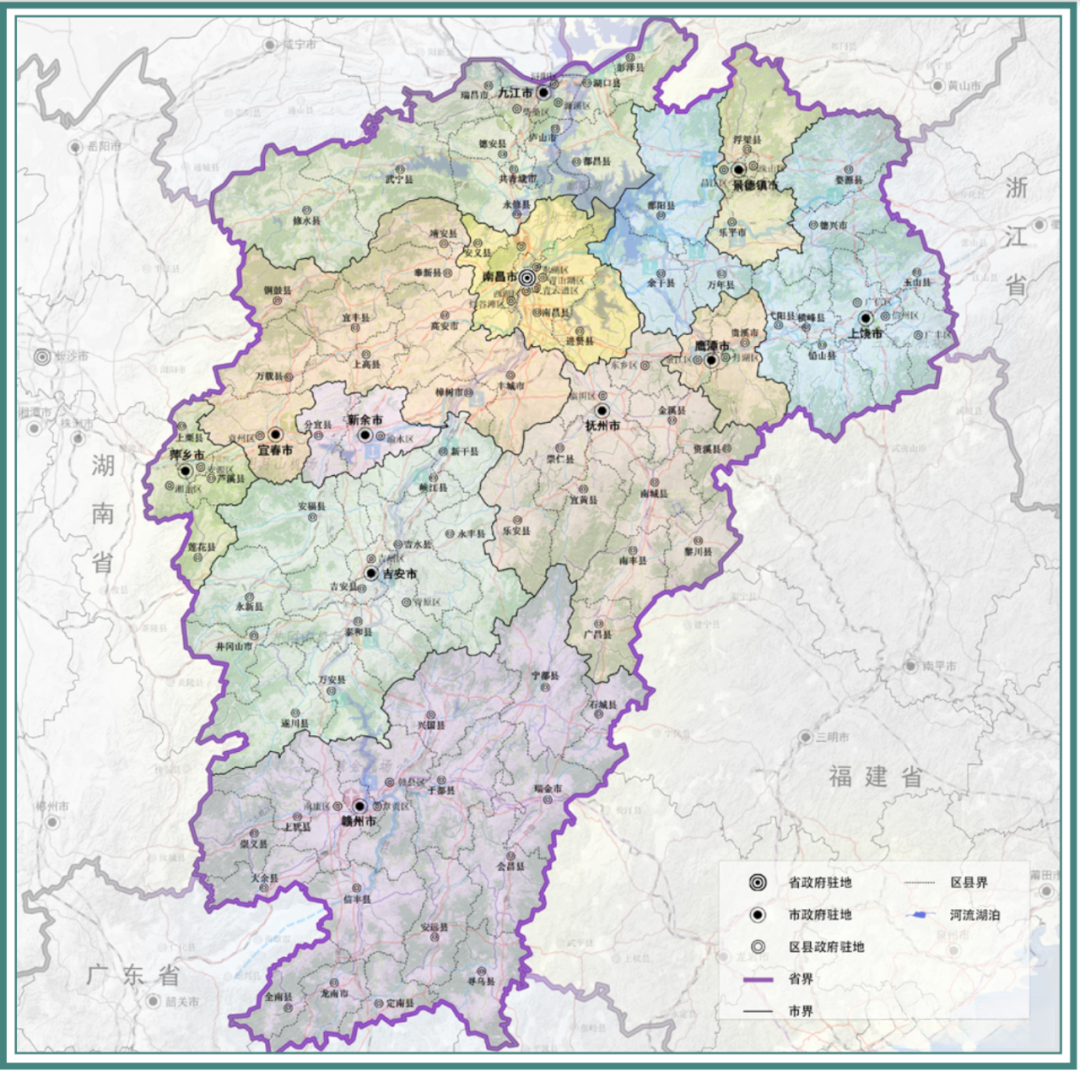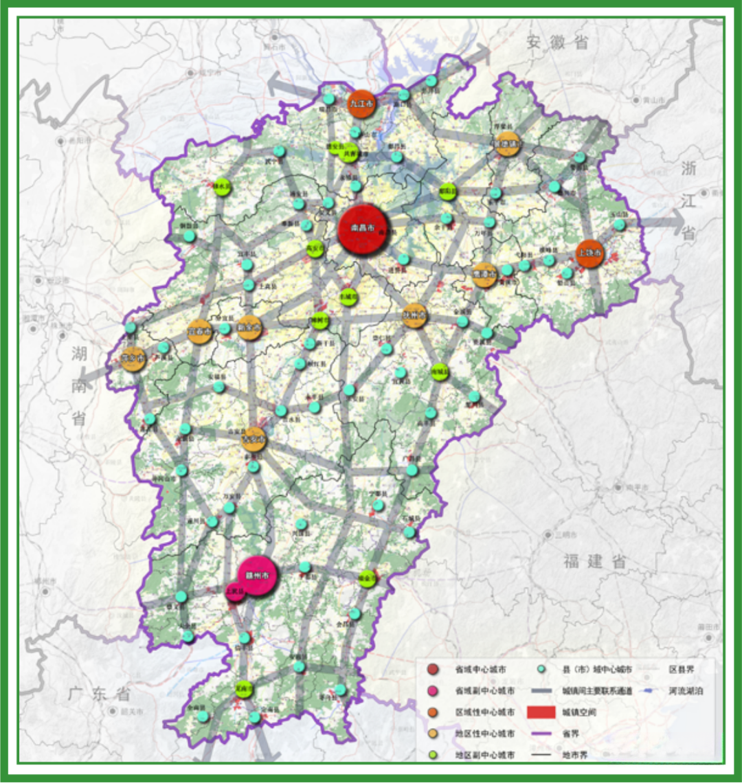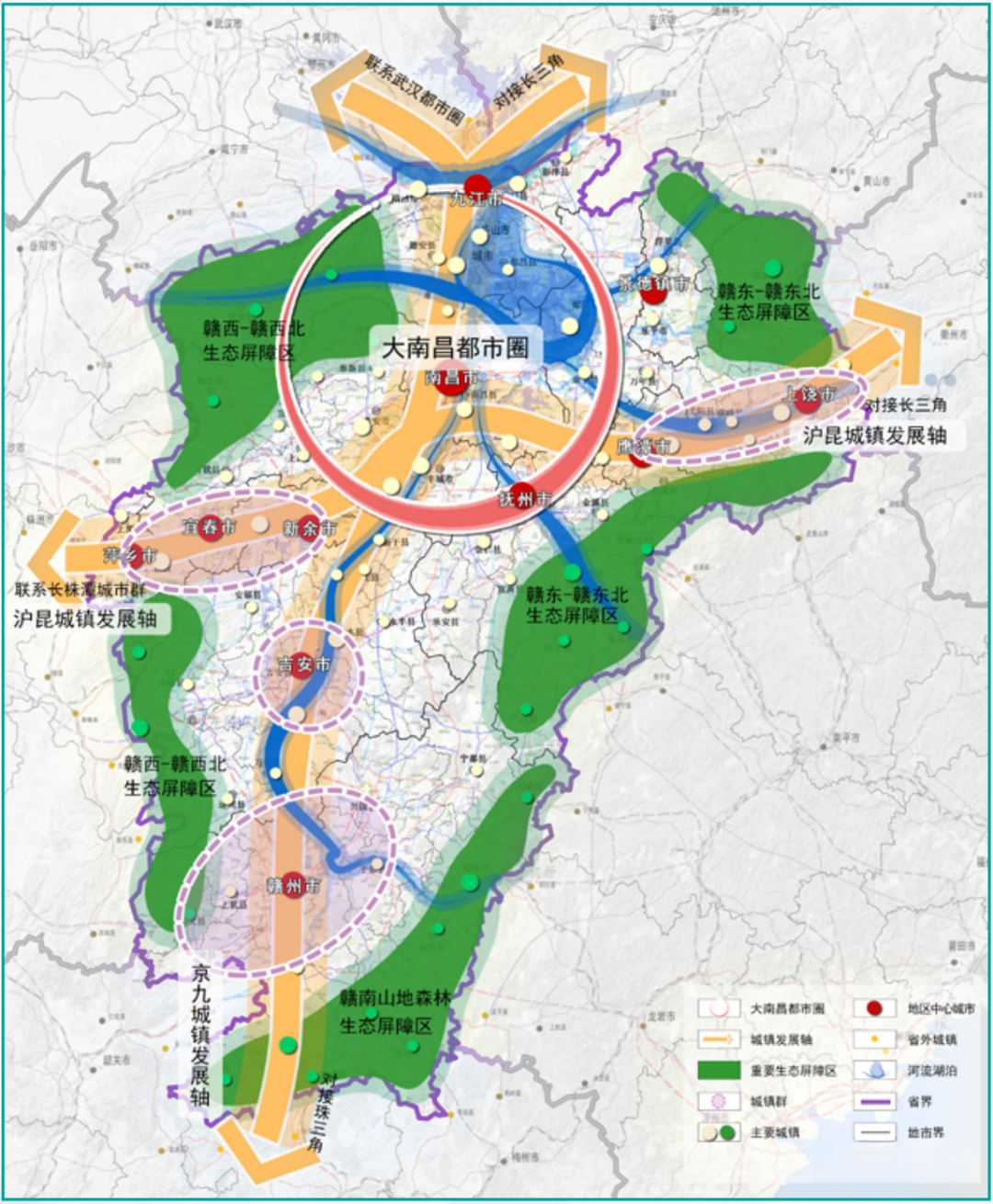 构建“一圈引领、两轴驱动、江湖联保、三屏筑底”的国土空间总体格局。“一圈引领”以大南昌都市圈为引领,形成带动全省发展的核心地区;“两轴驱动”强化沪昆(浙赣)和京九高铁两条开发主轴;“江湖联保”统筹长江、鄱阳湖和赣江等省内主要河流的生态环境保护;“三屏筑底”围绕赣东 - 赣东北、赣西-赣西北、赣南的山地丘陵地区,筑牢3个森林生态安全屏障。