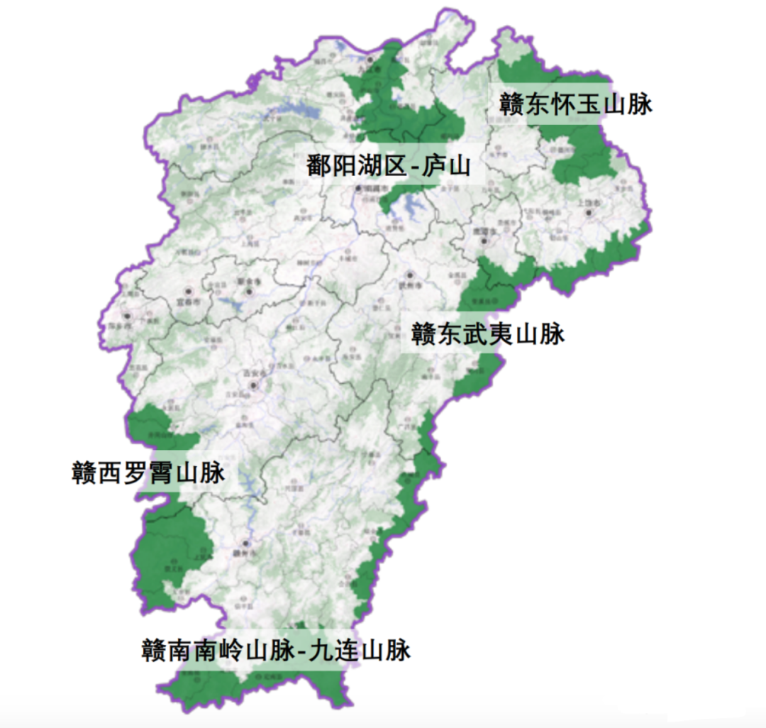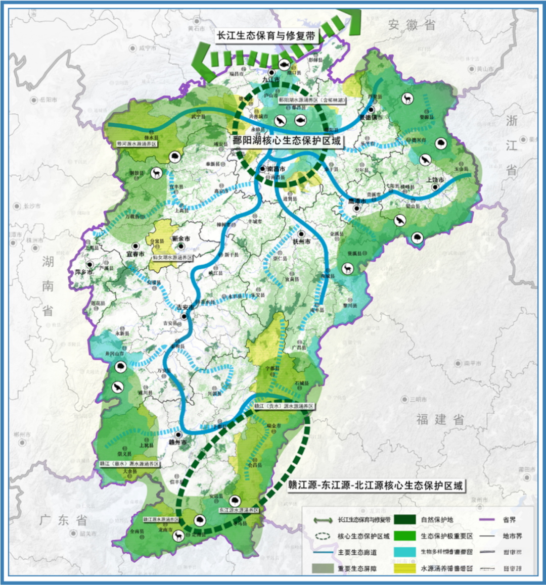 生态筑屏:严守生态保护红线,建立自然保护地体系;以流域分区为单元推进“山水林田湖草沙”生命共同体整体保护和生态修复;实现鄱阳湖“一湖清水”与赣东 - 赣东北、赣西 -赣西北和赣南等山地森林生态屏障的高水平保护。
