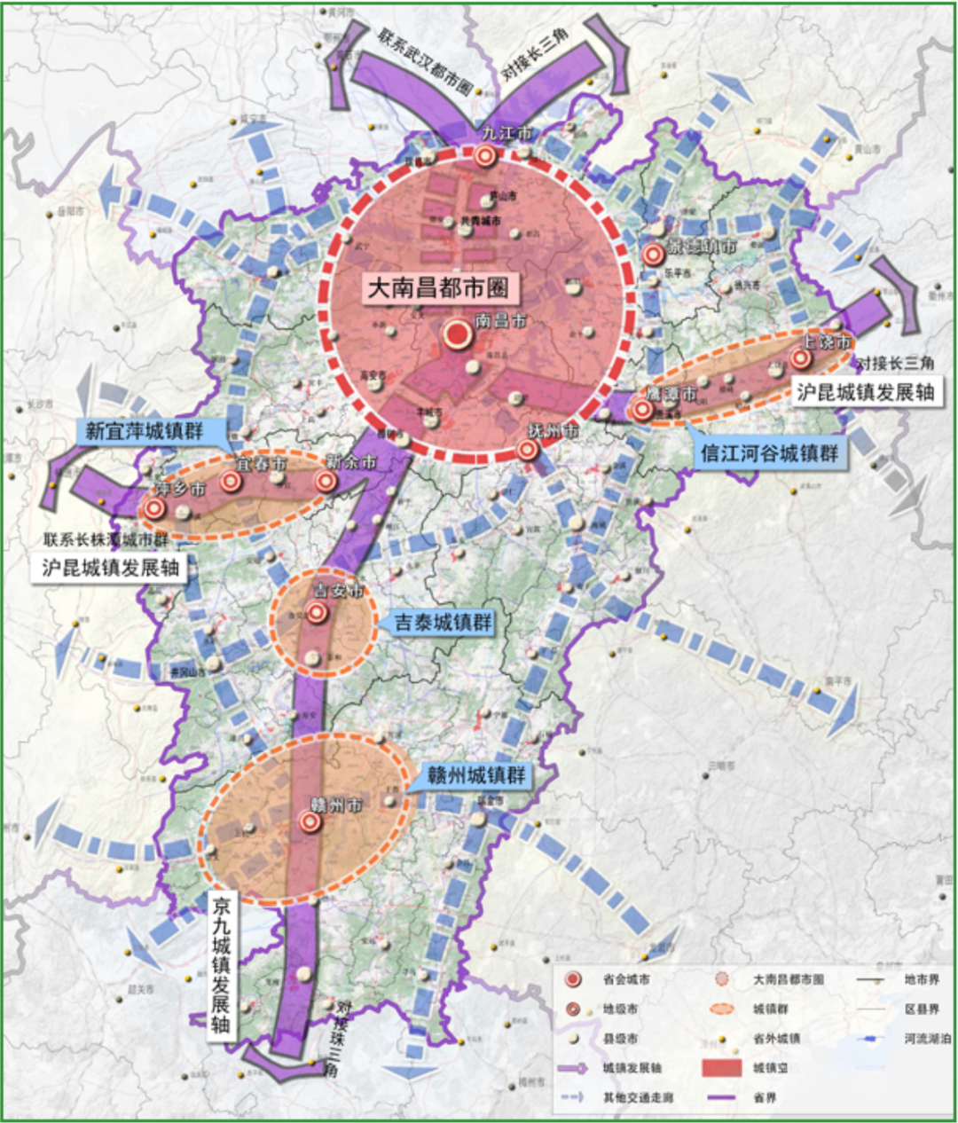 构建“一圈两轴多群”的城镇开发格局,“一圈”做强做优大南昌都市圈。“两轴”强化沪昆(浙赣)、京九两大城镇发展轴沿线要素集聚能力,构建承东启西、纵贯南北的内陆双向开放大通道。“多群”培育赣州、信江河谷(上饶、鹰潭)、新宜萍、吉泰等多个城镇群,带动赣南、赣东北、赣西区域加快发展、联动协同。