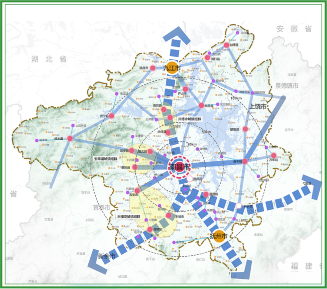 都市圈引领:推动大南昌都市圈建设,培育发展现代化都市圈,重点增强南昌中心城区能级;加强对赣江新区发展支持,与南昌共建都市圈发展核心;深化昌九、昌抚一体化;加快 “1 小时”交通圈建设。