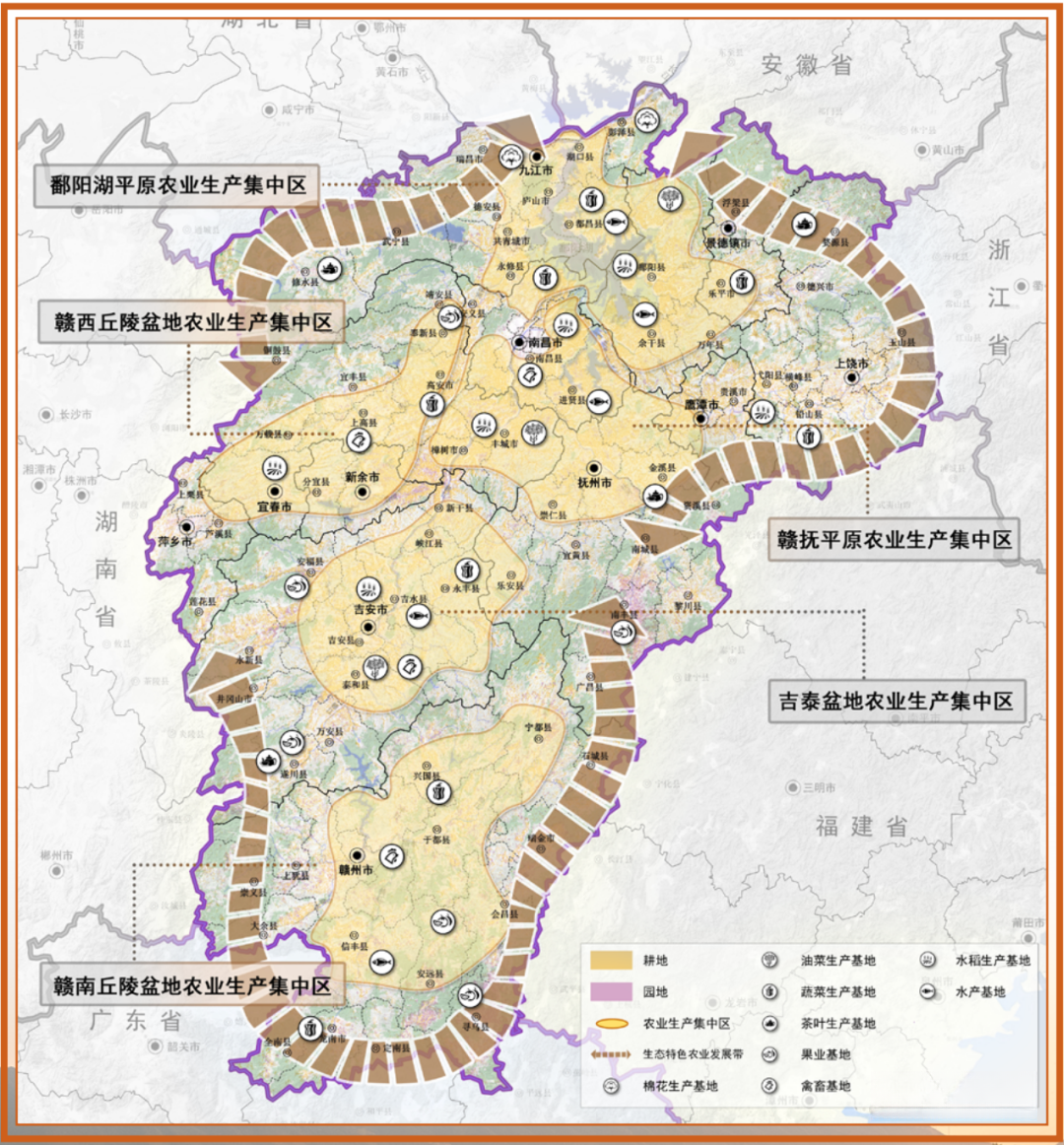 构建“五区三带”的农业空间格局,“五区”:鄱阳湖平原、赣抚平原、吉泰盆地、赣南丘陵盆地、赣西丘陵盆地5个农业生产集中区。“三带”:赣西北、赣东北、赣南3个生态特色农业发展带。
