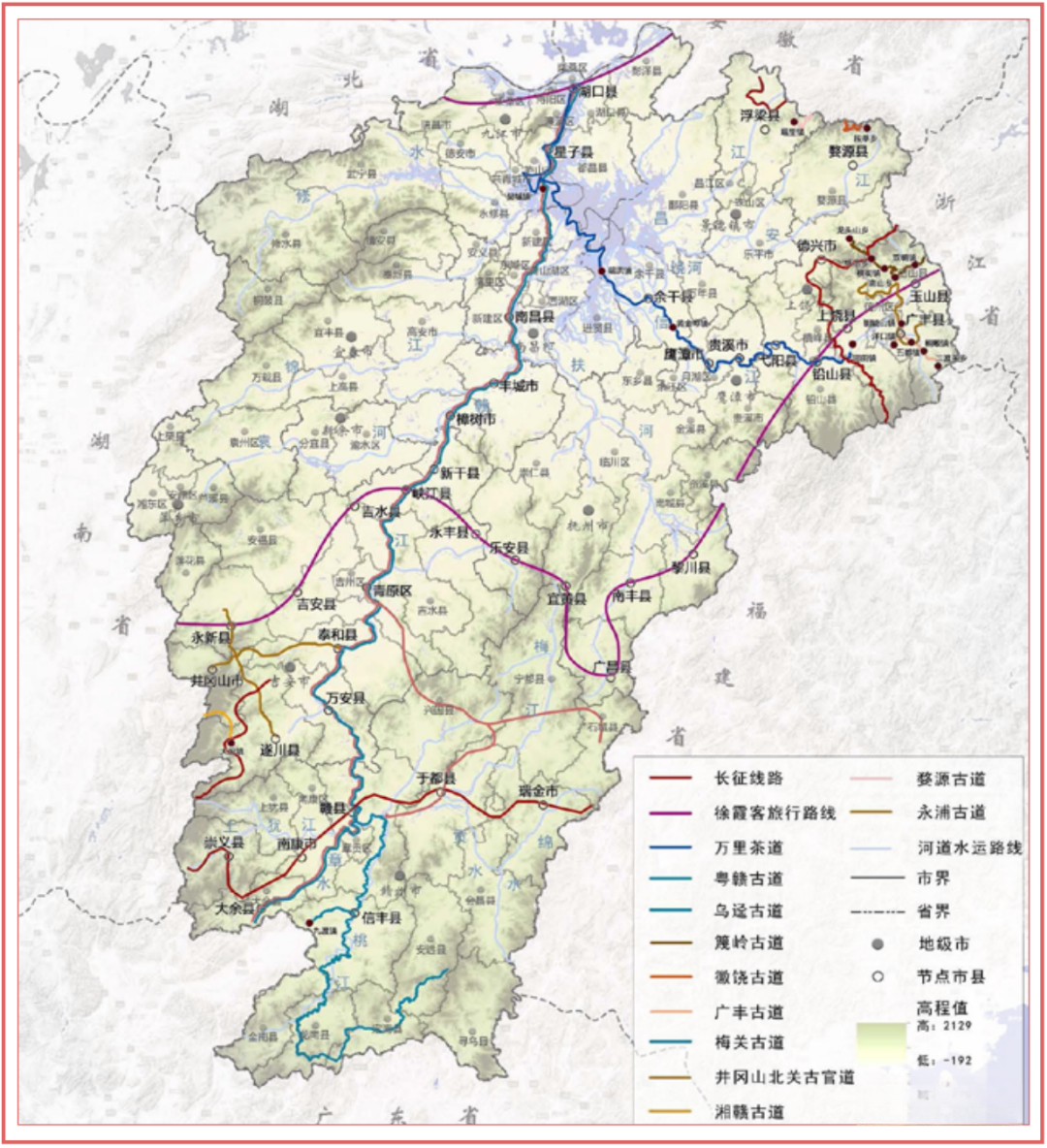 建立历史文化保护空间体系推动重要文化线路挖掘保护,加强赣粤古道、万里茶道、长征线路、客家迁徙线路、徐霞客旅行路线、徽饶古道、梅关古道、篾岭古道、广丰古道、乌迳古道、赣湘古道、浙赣古道、井冈山北关古官道等。