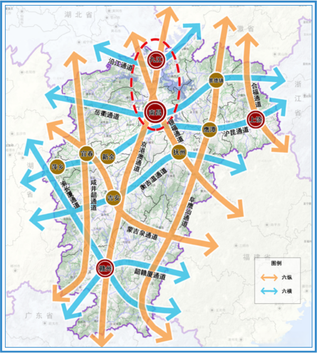 构建以“沪昆”、“京港澳”两条主轴为支撑的“六横六纵”,省域综合运输大通道,横向:沪昆、沿江、渝长厦、岳衢、衡吉温、韶赣厦通道纵向:京港澳、银福、合福、蒙吉泉、阜鹰汕、咸井韶通道。