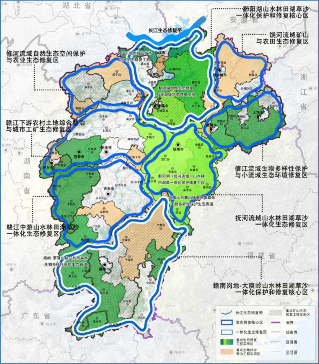 打造大湖流域全域生态修复示范区,“一带”:长江生态修复带。“两核”:鄱阳湖山水林田湖草沙一体化保护和修复核心区、赣南岗地 - 大庾岭山水林田湖草沙一体化保护和修复核心区。“六区”:饶河流域矿山与农田生态修复区、抚河流域山水林田湖草沙一体化生态修 复区、赣江中游山水林田湖草沙一体化生态修复区、修河流域自然生态空间保护与农业生态修复区、信江流域生物多样性保护与小流域生态环境修复区、赣江下游农村土地综合整治与城市工矿生态修复区。